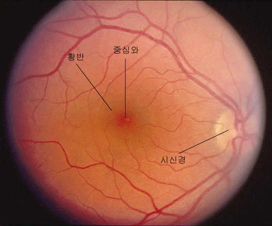 정상적인 사람의 망막은 다음과 같습니다. 오른쪽에 밝게 보이는 부분은 시신경이 지나가는 지점 즉, 왼쪽의 붉은 부분은 중심와, 중심와를 둘러싼 노란 부분은 황반입니다.