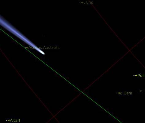 혜성 핵의 왼쪽 위에 있는 성단은 Beehive 성단으로서 메시에 목록 번호로는 M44입니다. 아래 이미지에서 가장 큰 점이 혜성의 핵입니다.