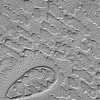 (2004/06/24) MGS(Mars Global Surveyor)의 MOC(화성 궤도 카메라; Mars Orbiter Camera)가 촬영한 화성 남극의 어느 지점입니다. MGS는 화성 둘레를 공전하고 있는 탐사선이며, MOC는 이 탐사선에 탑재되어 있는 고화질 카메라입니다. 화성의 남극 지역에 있는 지층에 가해진 침식의 결과라고 보여집니다. 왼쪽 아래에 있는 타원형의 구조도 한때 침식층 아래에 묻혀 있었던 것으로 보입니다. 침식 과정이 무엇이었는지 그리고 물질의 화학 성분이 어떤지는 아직 알려지지 않았습니다. 이것은 80.7°S, 300.9°W 근처의 영상으로서 폭이 3km... -